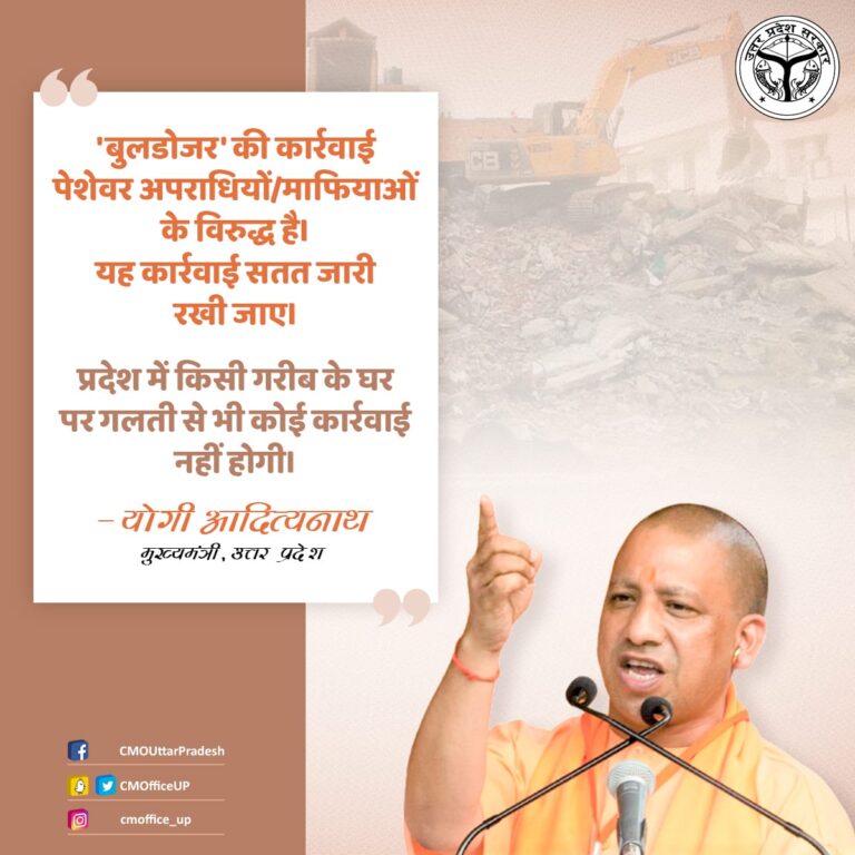 सोमवार को यू पी सी ऍम ऑफिस के ट्वीटर हैंडल के द्वारा सी ऍम श्री योगी आदित्यनाथ जी ने साफ़-साफ़ शब्दों में माफिया एवं पेशवर अपराधियों को बता दिया है कि उनकी सरकार ये बुलडोज़र की कार्रवाई सभी माफिया के विरुद्ध जारी रखेगी। साथ ही उन्होंने सभी अधिकारियों को इस बात को सुनिश्चित करने के लिए कहा है कि किसी भी गरीब के घर पर बुलडोजर न चले